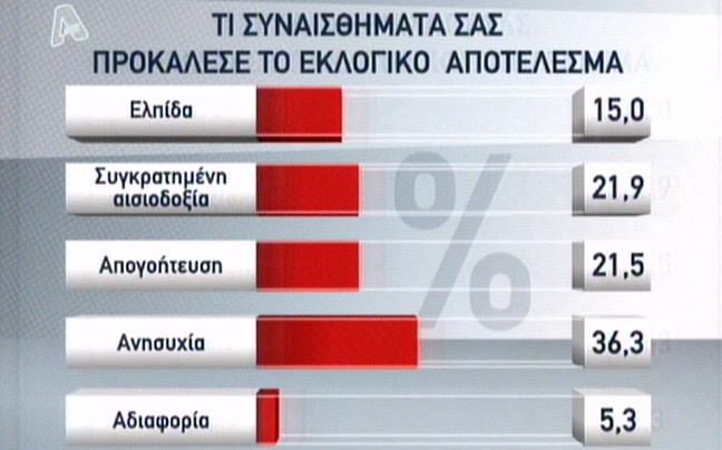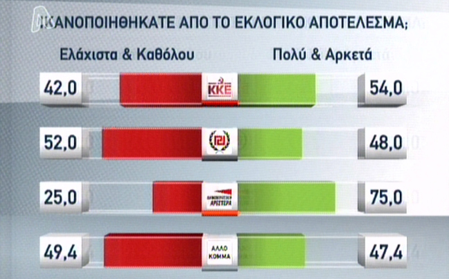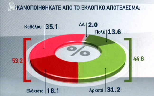 Όπως δείχνουν τα αποτελέσματα της έρευνας το 53,2% των ερωτηθέντων δεν ικανοποιήθηκε με το εκλογικό αποτέλεσμα, ενώ το 57,8% είναι απογοητευμένο και ανησυχεί από το αποτέλεσμα της κάλπης.