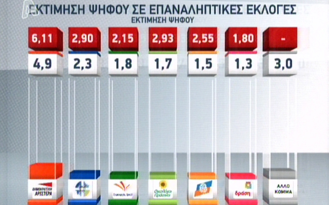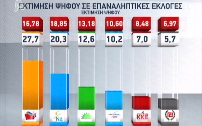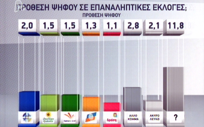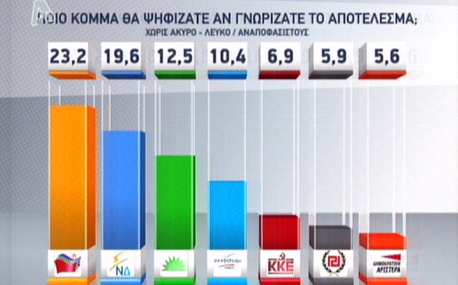Από την εκτίμηση εκλογικού αποτελέσματος (που περιλαμβάνει αναγωγές κτλ.) σε περίπτωση εκλογών σήμερα, οι δημοσκόποι εκτιμούν ότι ο ΣΥΡΙΖΑ θα έπαιρνε 27,7%, η ΝΔ 20,3%, το ΠΑΣΟΚ 12,6%, Ανεξάρτητοι Έλληνες 10,2%, ΚΚΕ 7%, Χρυσή Αυγή 5,7% και ΔΗΜΑΡ 4,9%.