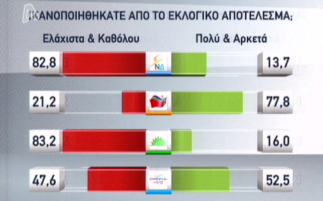 Μάλιστα 8 στους 10 ψηφοφόρους της ΝΔ, αλλά και του ΠΑΣΟΚ δήλωσαν ότι δεν ικανοποιήθηκαν από το αποτέλεσμα, ενώ περισσότεροι από 7 στους 10 ψηφοφόρους του ΣΥΡΙΖΑ και της ΔΗΜΑΡ δήλωσαν ικανοποιημένοι.