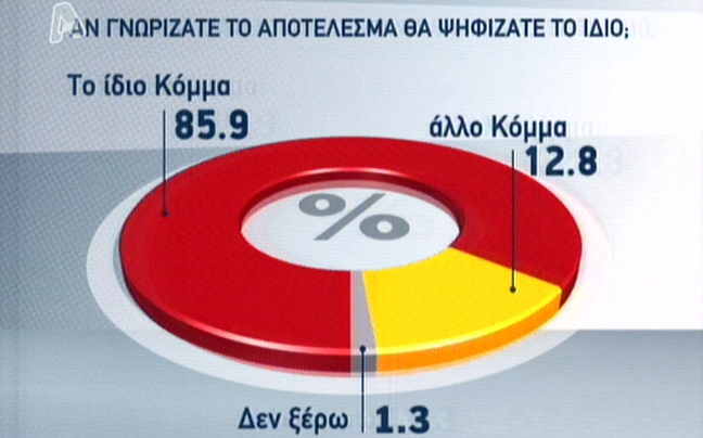 Στο ερώτημα αν «γνωρίζοντας το αποτέλεσμα θα ψήφιζαν το ίδιο κόμμα», το 13% δηλώνει όχι, δηλαδή θα άλλαζε την ψήφο του και το 85,9% ότι θα ψήφιζε το ίδιο κόμμα. Το ποσοστό των πολιτών που θα άλλαζε κόμμα θα ψήφιζε κατά 23% ΣΥΡΙΖΑ, 19,6% ΝΔ, 12,5% ΠΑΣΟΚ, 10,4%, Ανεξάρτητους Έλληνες, 6,9% ΚΚΕ, 5,9% Χρυσή Αυγή και 5,6% ΔΗΜΑΡ.
