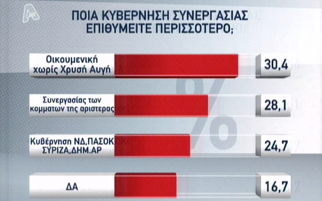 Το 30,4% ζητάει οικουμενική κυβέρνηση χωρίς τη Χρυσή Αυγή και το 28,1% κυβέρνηση της αριστεράς. Επίσης το 24,7% ζητούν κυβέρνηση με ΝΔ, ΠΑΣΟΚ, ΣΥΡΙΖΑ, ΔΗΜΑΡ.